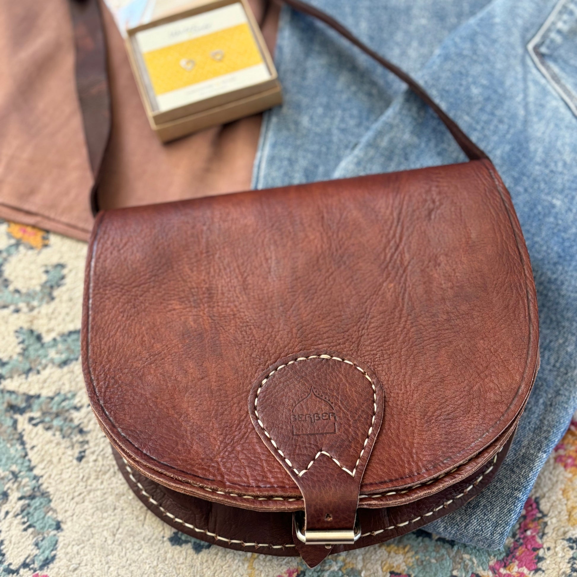 Features 100% Full Grain Moroccan Leather 2 Inside Compartments (one zipped) Adjustable Cross-body Strap Strong Metal Buckle Hand-Stitched Detail Size Guide Height: 23cm Width: 26cm Depth: 7.5cm Please note - all Berber products are made from naturally tanned full-grain leather. This leather showcases all the natural markings of the hide from the animal's life. Our products hold a natural leather smell - so you know it's the genuine thing!