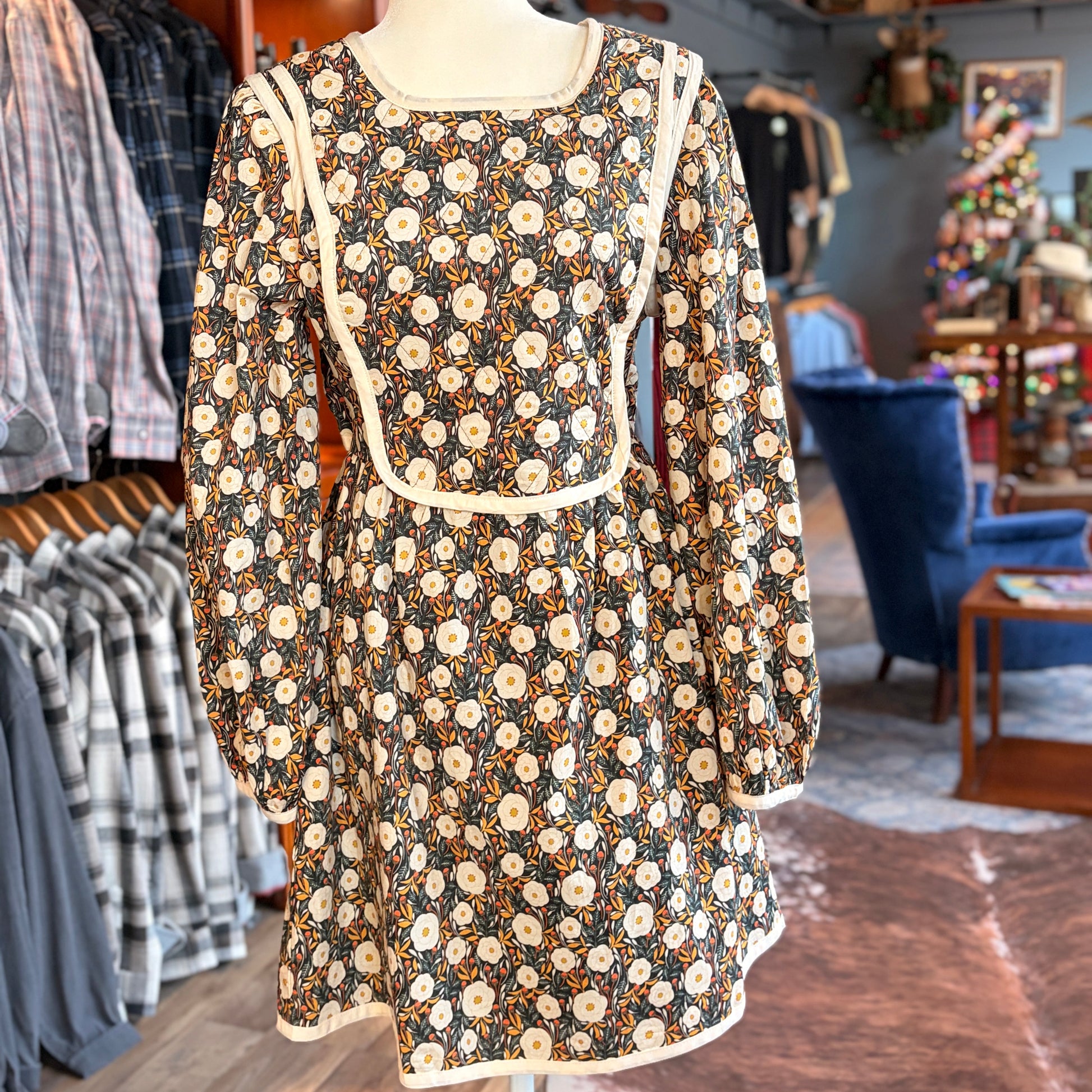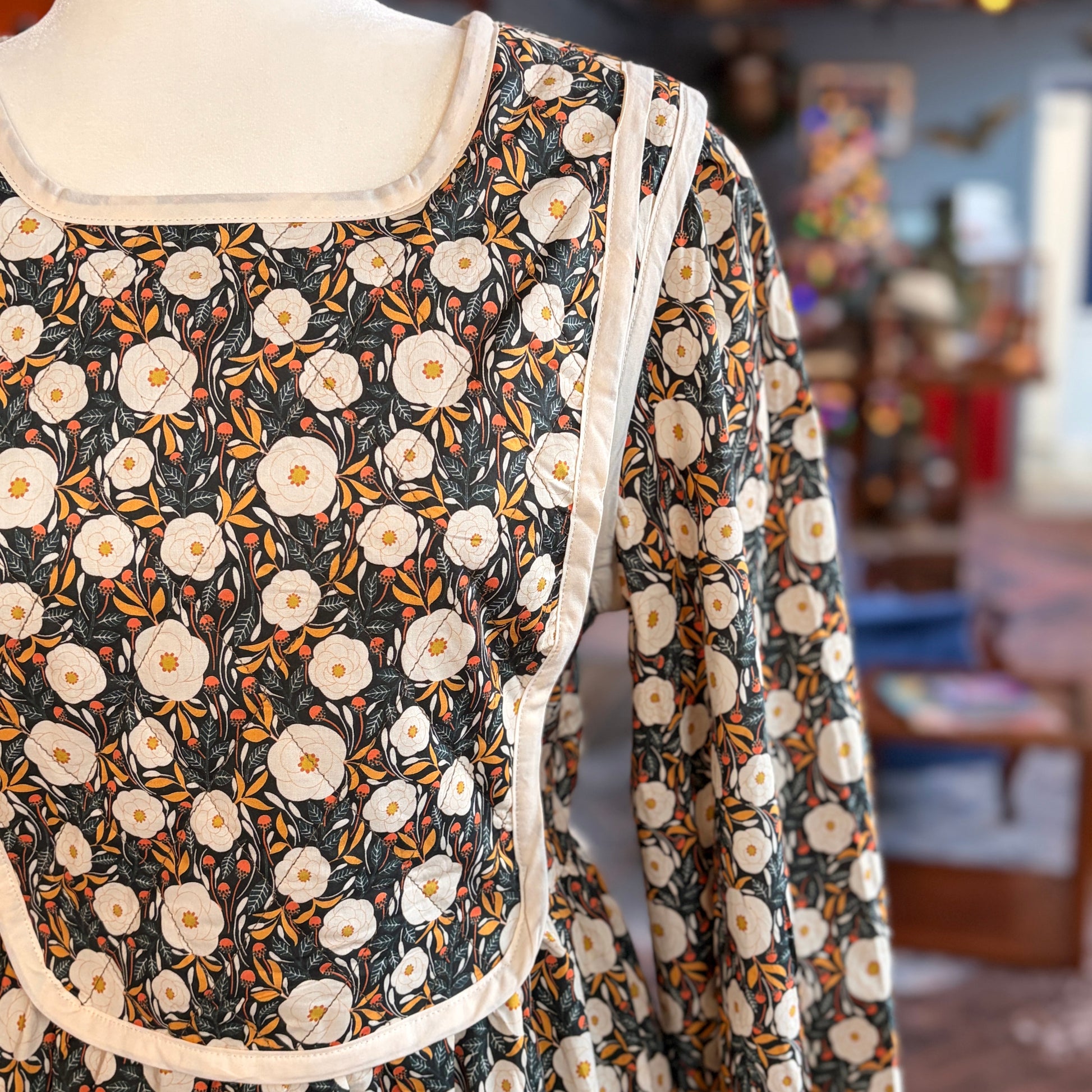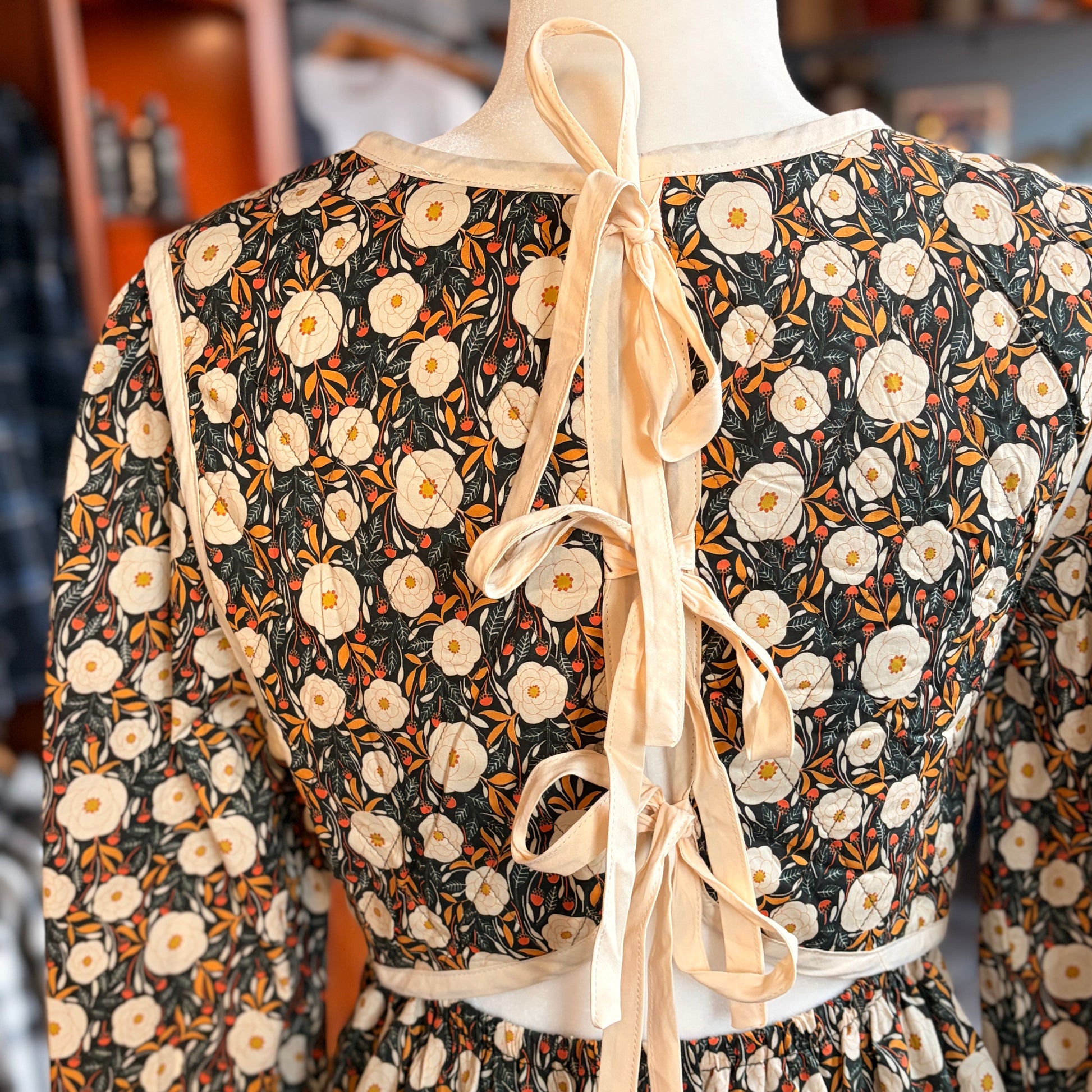 This quilted floral mini dress is pure charm! Featuring a vibrant black multi floral print, it boasts a playful round neckline and long puff sleeves finished with contrast binding cuffs. Quilted seams highlight both front and back panels, while an open back with triple ties and elastic adds a flirty, feminine flair. Fully lined for comfort, this dress is perfect for twirling into any occasion with confidence and fun.